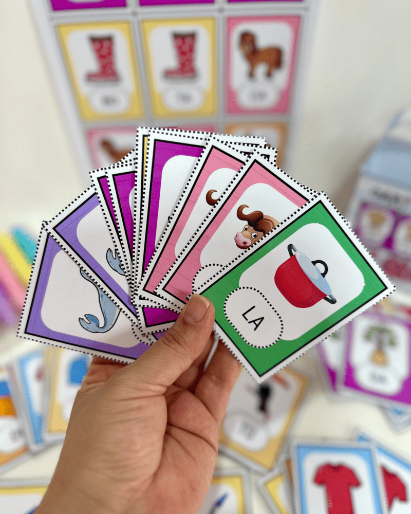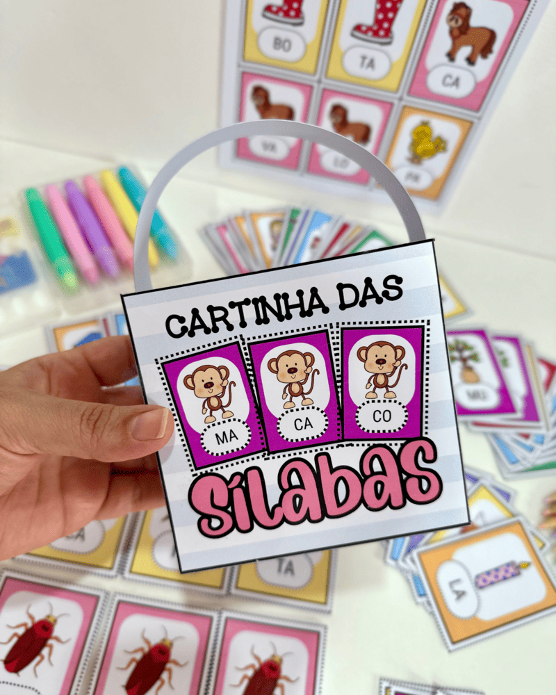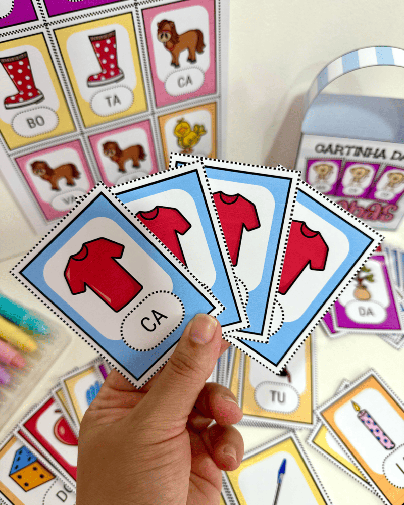 A criança utiliza as cartinhas ilustradas para realizar a leitura das sílabas e a formação das palavras. As palavras estão divididas por sílabas, facilitando a associação entre som e grafia e promovendo uma aprendizagem mais significativa.