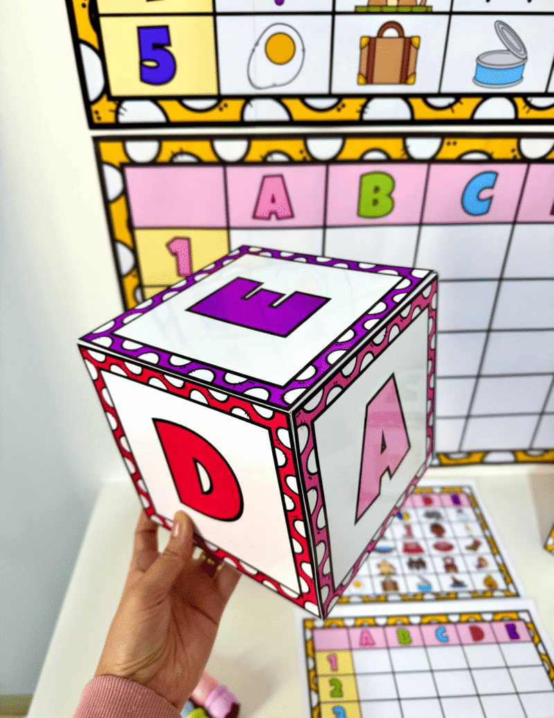 A criança joga os dados, identifica a figura correspondente à linha e coluna sorteadas e realiza a escrita da palavra na tabela em branco.